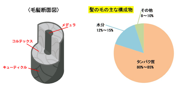 髪は大きく3構造に分かれていますが、これらを構成する成分の80%以上がタンパク質でできています。(髪=タンパク質の集まり)